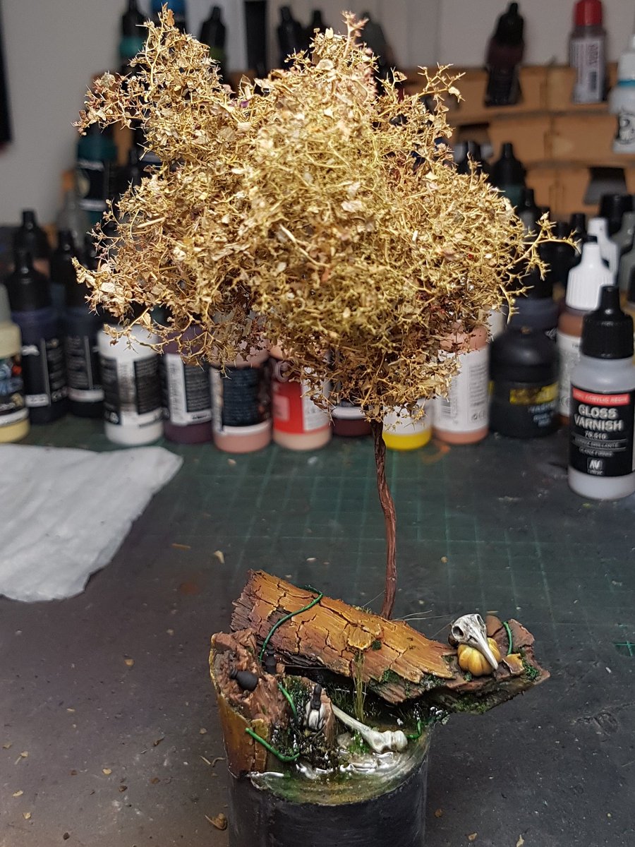 I started by airbrushing some brown to the tree, and started highlighting up through the brown and orange tones. The next step which really brought it to life was adding some shading with green, particularly focused on rivulet type areas where the water would run down. I painted little bottles and bits and bobs, then spent a bit more time adding some moss and green tones to the base. Added more flocking and got it all to a stage I was happy with.
